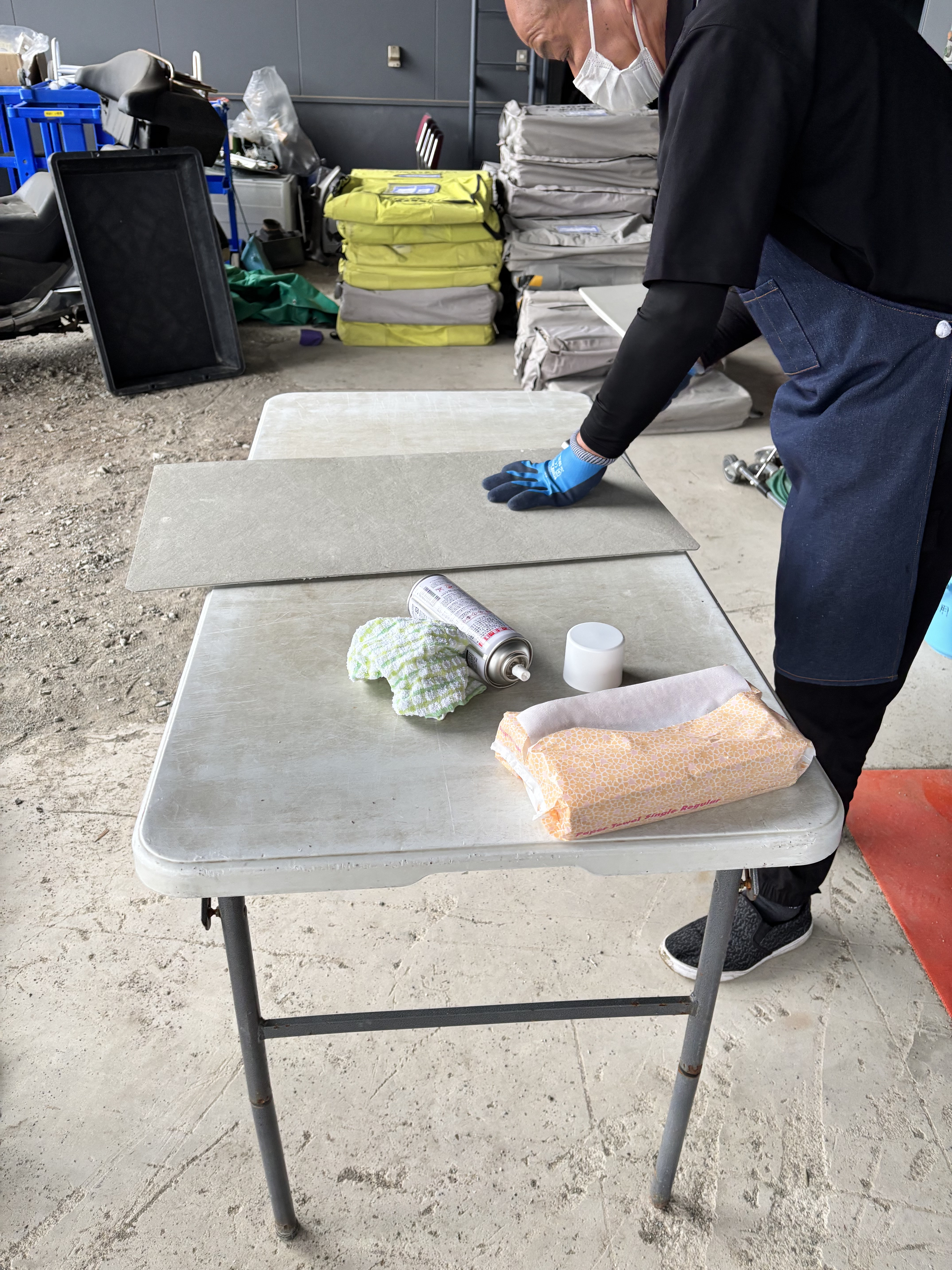 養生板の作業は、洗浄、乾燥、研磨、袋詰めの順に進めていきます。
